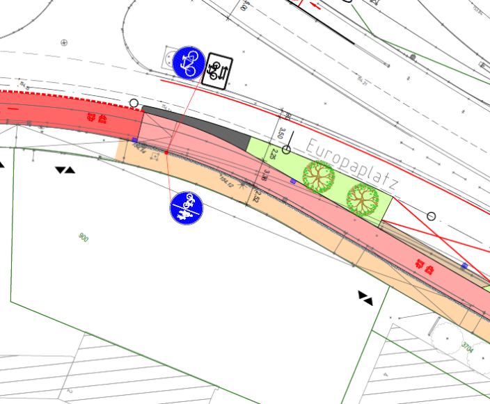 Die Planungen zum Verlauf der RVR haben sich unsererseits nicht verändert. Das von Ihnen benannte Teilstück zwischen Europaplatz und der Tankstelle wurde im Zuge der Baumaßnahme Europaplatz baulich (bis auf eine kleines Teilstück) und beschilderungstechnisch nicht verändert, sondern wie im Bestand belassen.